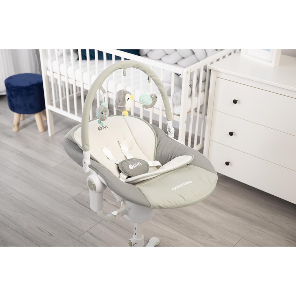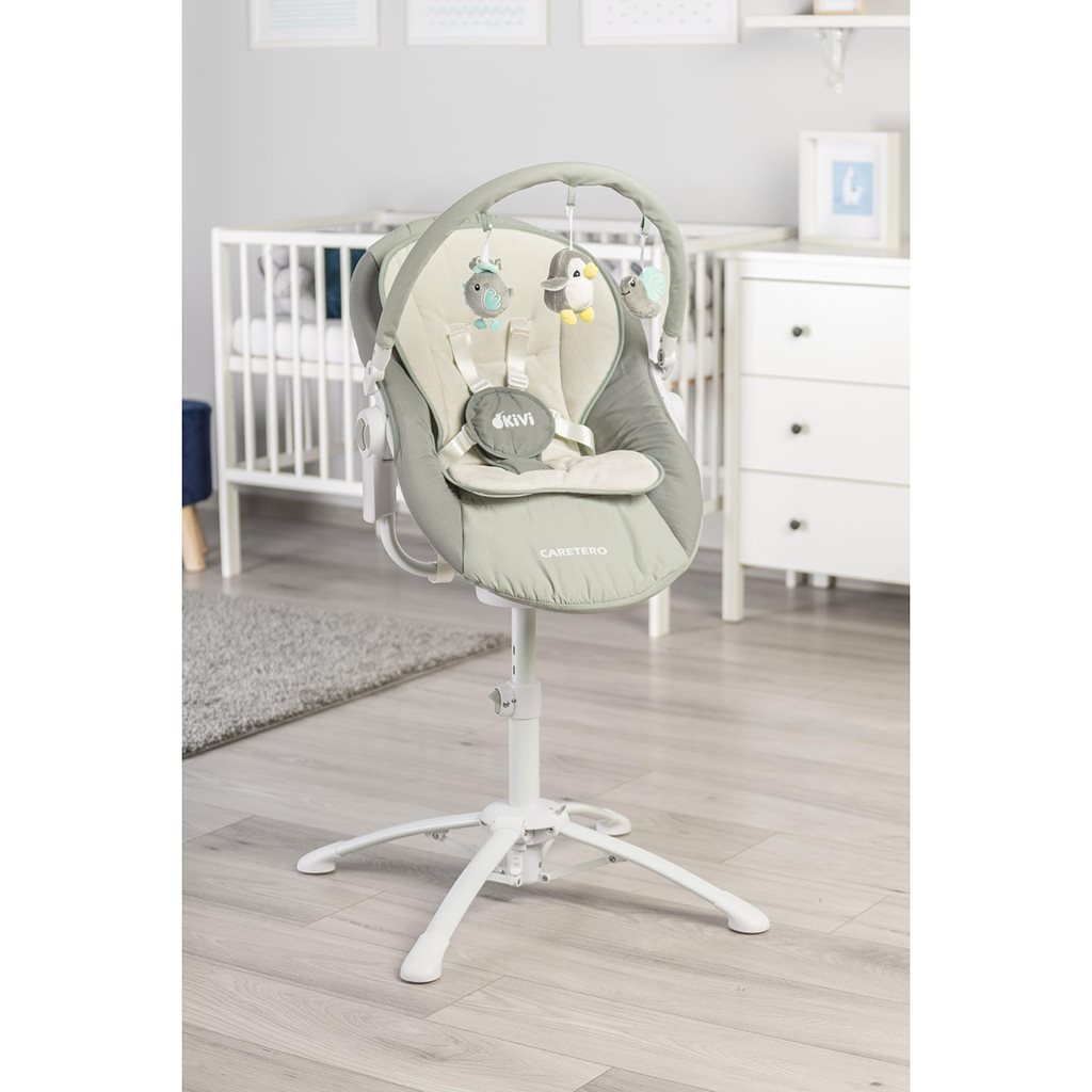 Stolička Kivi je moderný, dizajnový a funkčný produkt, ktorý kombinuje 3 funkcie - jedálenskú stoličku, lehátko a detskú hojdačku. Hojdacia varianta má hojdací mechanizmus, vibračnú funkciu a vstavané melódie. Hojdačku môžete ovládať pomocou diaľkového ovládača.