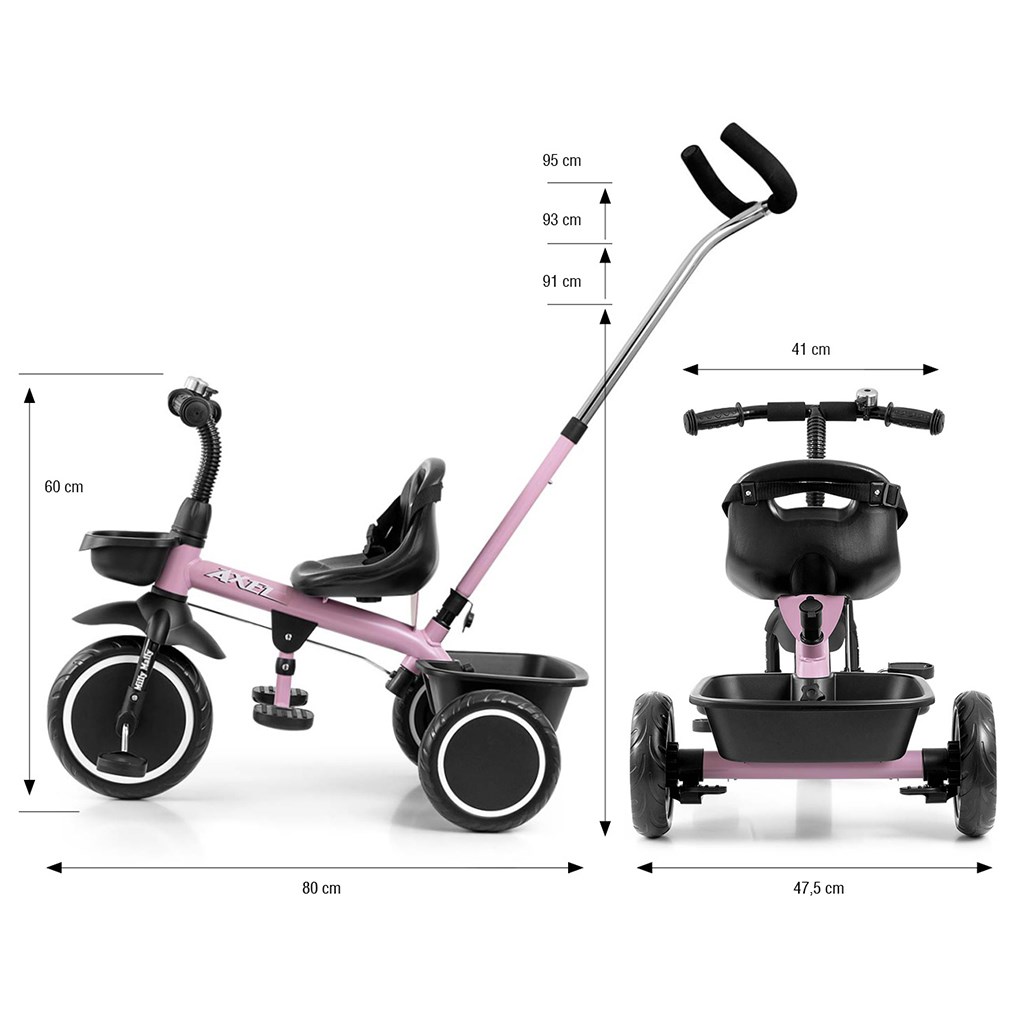Detská šliapacia trojkolka s rukoväťou Axel je určená pre deti vo veku od 1 do 3 rokov. Je vyrobená z kvalitných a odolných materiálov. Má pohodlné a ergonomicky tvarované sedadlo, kde vzdialenosť k riadidlám možno ľahko nastaviť a tým prispôsobiť trojkolku veku a výške dieťaťa. Trojkolka patrí k produktom skupiny GROW UP, teda rastie s dieťaťom. Na prednom kolese je možné uvoľniť náhon na pedále a pomocou vodiacej tyče tlačiť malého pretekára, keď mu dôjdu sily. Široké kolesá vyrobené z tvrdenej peny EVA, zaručí pohodlie a odolnosť na každom povrchu. Do dvoch praktických košíkov si váš malý pretekár naskladá všetky potrebné hračky a môže vyraziť v ústrety dobrodružstvám. Kombinácia kovovej konštrukcie a súčiastok vyrobených z najkvalitnejších materiálov zaručuje odolnosť za všetkých podmienok. Pre maximálne bezpečie dieťaťa má trojkolka bezpečnostné pásy.