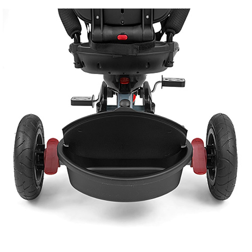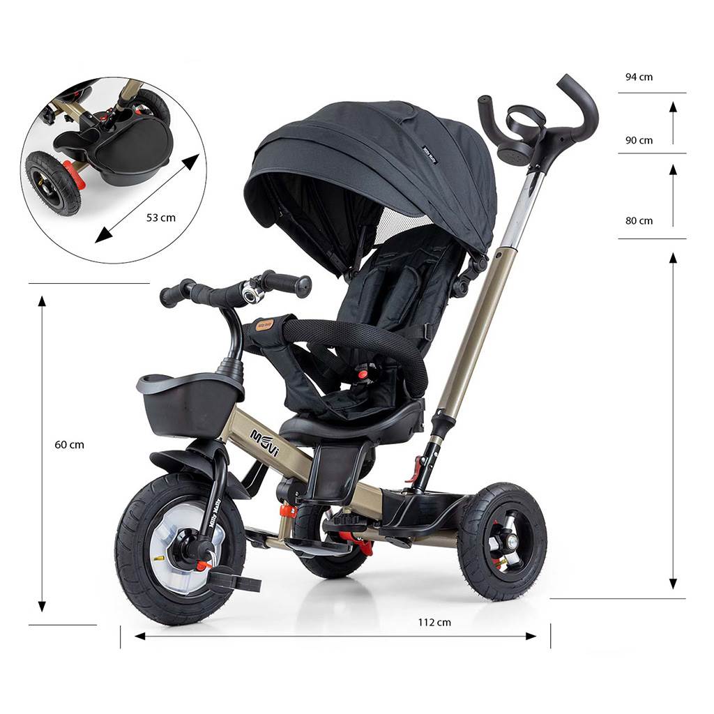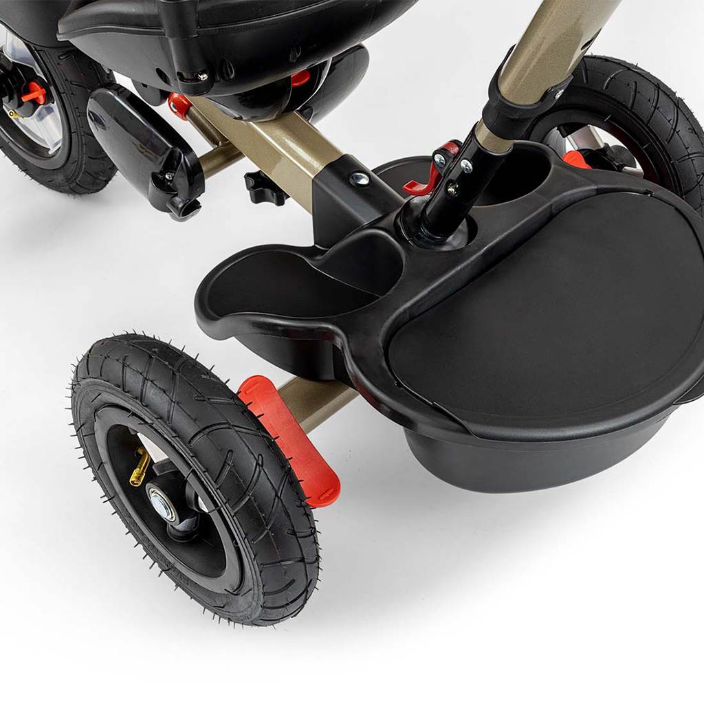 Je vyrobená z kvalitných a odolných materiálov. Má modernú konštrukciu, pohodlné a ergonomicky tvarované sedadlo, ktoré je otočné o 360 stupňov, čo umožní dieťaťu cestovať v smere alebo proti smeru jazdy. O pohodlie a bezpečie počas jazdy sa starajú bariérky, trojbodové bezpečnostné pásy, pohodlné stúpatka, alebo veľké nafukovacie kolesá, ktoré skvele absorbujú nárázy a poskytujú dobrú priľnavosť. Trojkolku môže ovládať ako dieťa, tak aj rodič pomocou nastaviteľnej rukoväte pre tlačenie. Po odobratí vodiacej tyče, sklápacej striešky, ktorá chráni pred slnkom alebo ostatných komponentov bude slúžiť ako trojkolka. Trojkolku je možné používať aj ako alternatívu golfového kočíka. Pre uloženie hračiek, alebo potrieb pre dieťa je tu praktický úložný košík.
