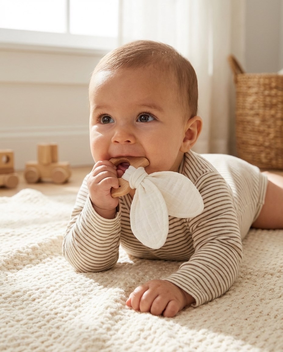 Hryzátko s mušelínovou plienkou je ideálna súprava, keď sa dieťaťu prerezávajú zúbky. Hryzátko je vyrobené z bukového dreva šetrného k životnému prostrediu a mäkkej mušelínovej tkaniny. Je úplne bezpečná pre bábätká a prináša upokojujúcu úľavu pri prerezávaní zúbkov. Hryzátko možno použiť aj ako hračku pre bábätká. Hryzátko sa dokonale hodí k našim ostatným mušelínovým výrobkom a vytvára krásnu súpravu, ktorú môžete darovať ako darček na oslavu narodenia dieťaťa.