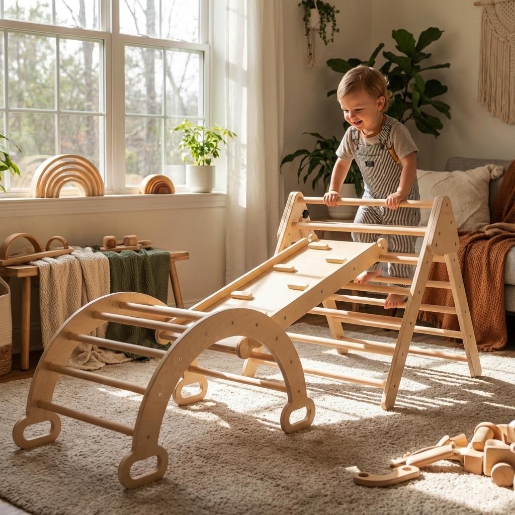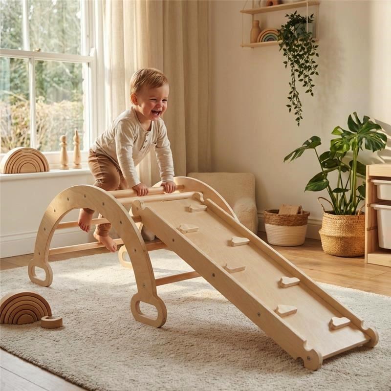 Drevená Montessori (Pikler) lezecká zostava Baby Mix pomáha deťom prirodzene rozvíjať pohyb, rovnováhu aj sebavedomie. Vďaka variabilnej konštrukcii sa skladá z viacerých prvkov, ktoré je možné kombinovať a prispôsobiť veku aj schopnostiam dieťaťa.