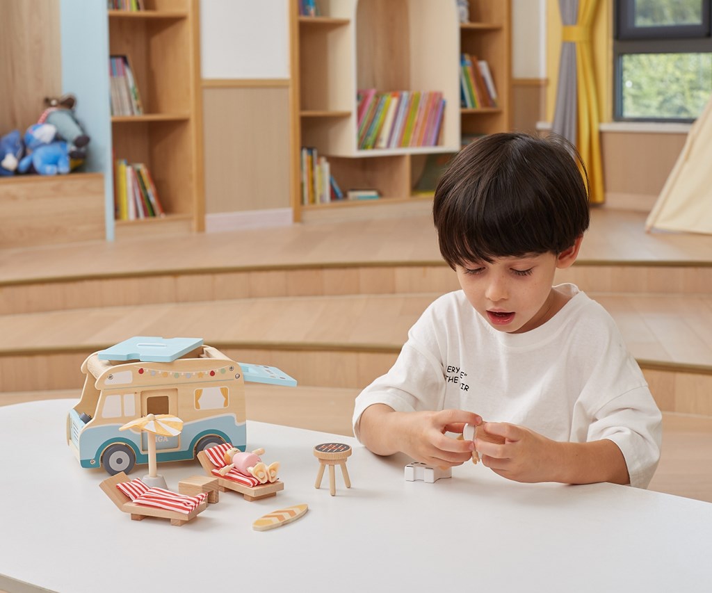 Rozvoj predstavivosti – karavan s doplnkami umožňuje deťom vytvárať kreatívne scénky ako prázdninové výlety, plážové dni či grilovanie