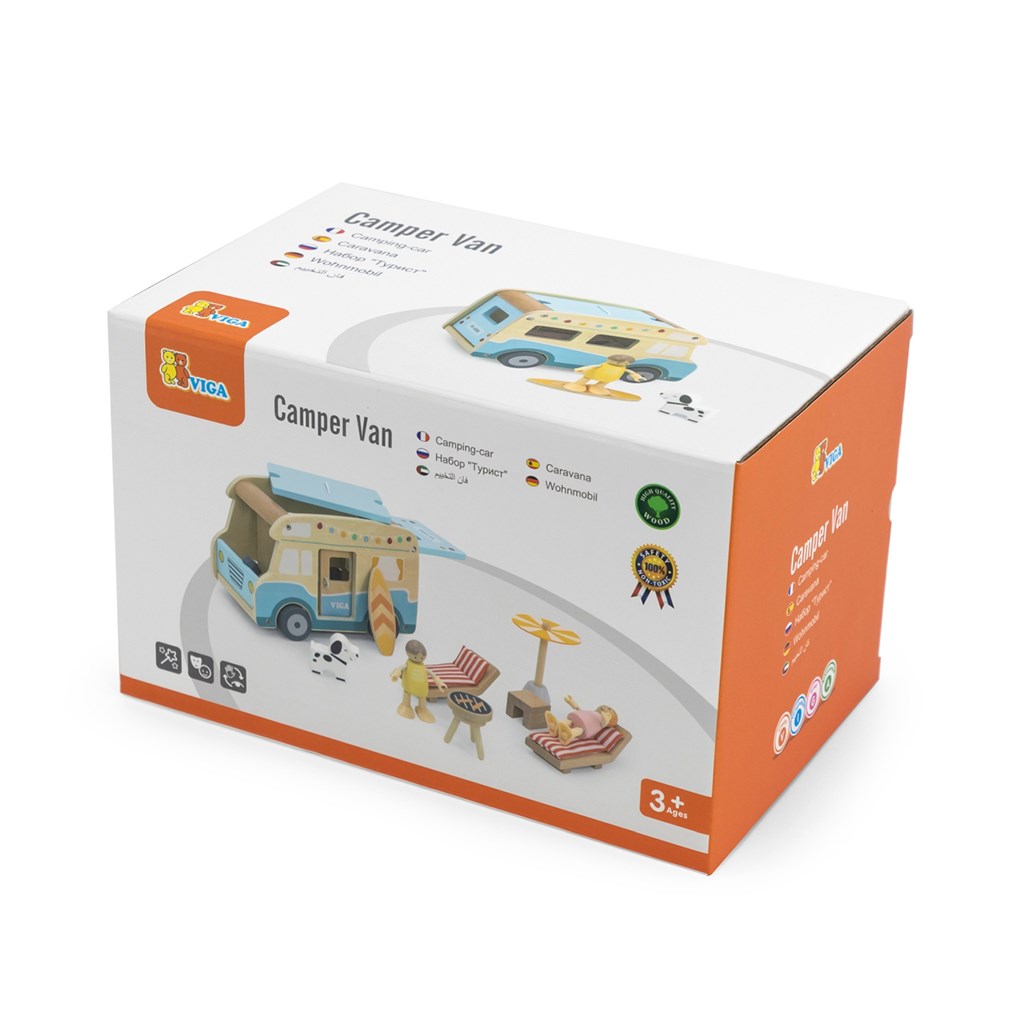 Drevený karavan je výnimočná hračka, ktorá prenesie deti do sveta prázdninových dobrodružstiev a letných ciest! Sada je inšpirovaná bezstarostnými výjazdmi k moru, a vďaka precíznym detailom a realistickým funkciám — ako posuvné dvere, výsuvná strecha či strešný nosič na surfovaciu dosku — poskytuje deťom hodiny pútavej a tvorivej hry. Karavan obsahuje bohaté príslušenstvo vrátane dvoch bábik, psíka, lehátok s vankúšikmi, plážového slnečníka, grilu, dokonca aj surfovacej dosky, čo umožňuje napodobňovať rôzne scénky hry. Deti si môžu vymýšľať situácie s cestovaním, odpočinkom na pláži či organizovaním pikniku.