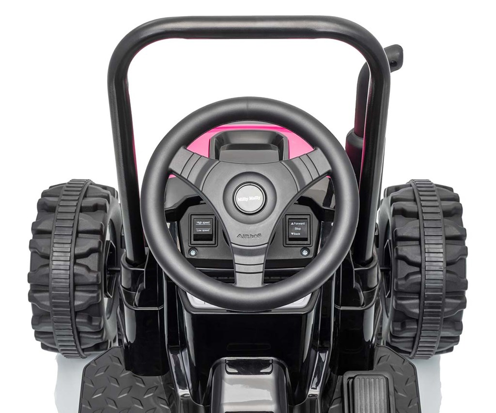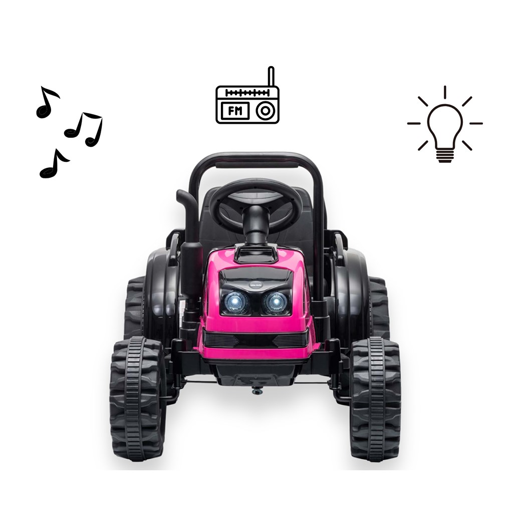 Je to ideálne vozidlo pre deti vo veku od 3 do 5 rokov. Traktor sa dodáva s prívesom pre väčšiu zábavu. Kovové bezpečnostné tyče vpredu a vzadu a imitácia komína/výfuku, vrčiaci zvuk motora traktora, to všetko umožňuje malým vodičom popustiť uzdu svojej fantázii a cítiť sa ako skutoční traktoristi. Vypínač aktivuje realistický vrčivý zvuk motora traktora, zatiaľ čo tlačidlo súčasne vypína vozidlo. Dva motory umiestnené v traktore dosahujú priemernú rýchlosť 3 - 5 km/h.