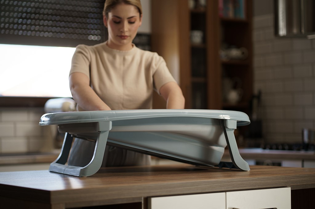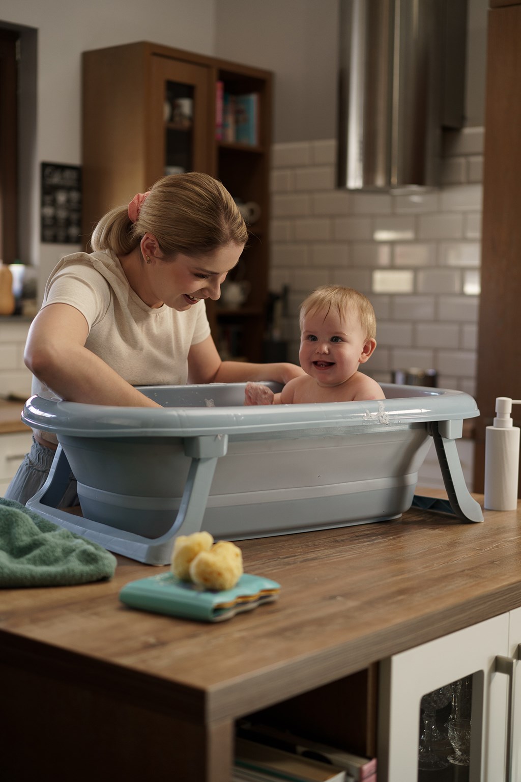 Vanička je vybavená výpustným ventilom a pásikovým teplomerom, čo výrazne zvyšuje komfort a bezpečnosť pri každodennom používaní. Dá sa jednoducho zložiť na výšku len 10 cm, pričom plastové nožičky sa sklopia priamo pod vaničku – vďaka čomu zaberá minimum miesta a je ideálna na skladovanie aj v menších priestoroch.