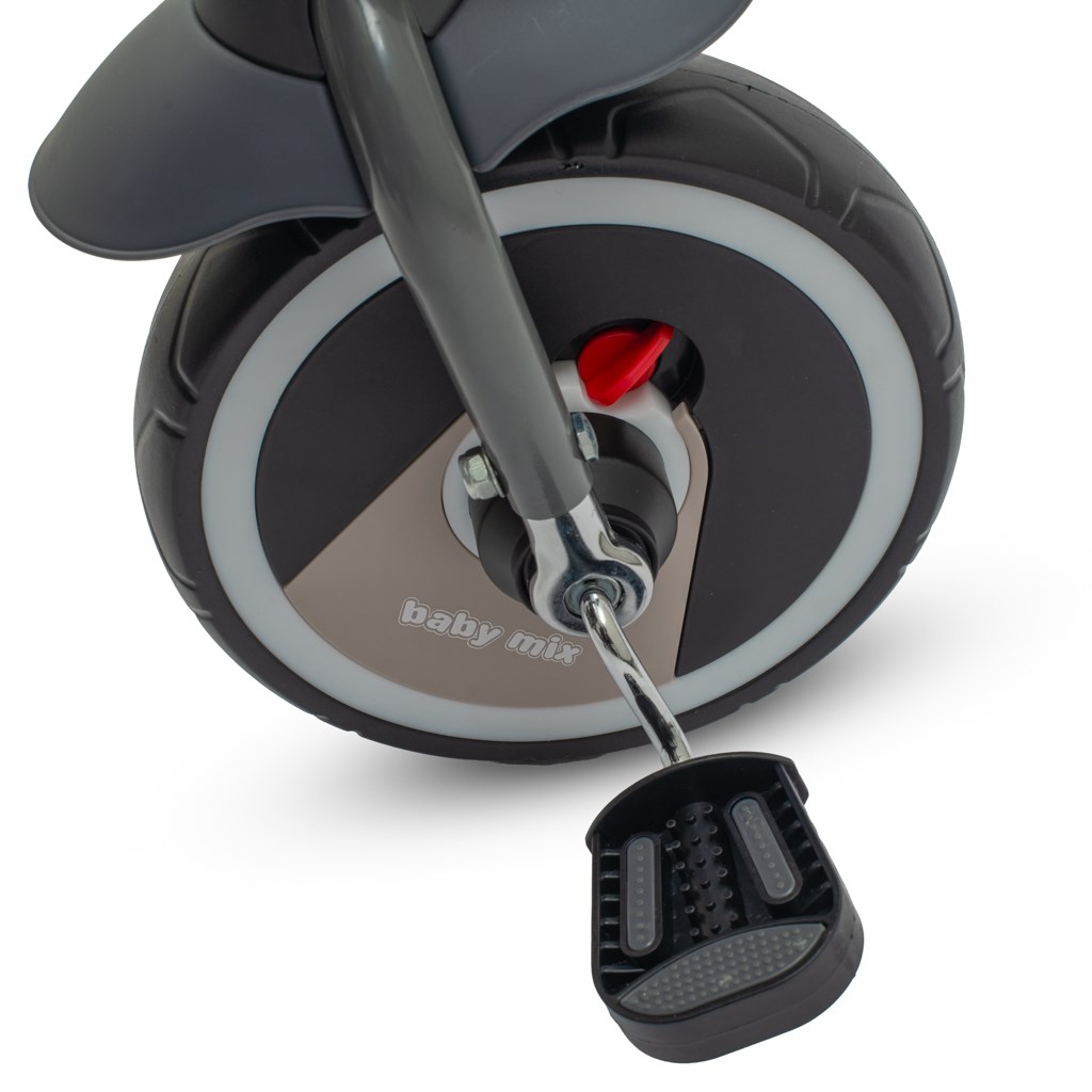 Detská šliapacia trojkolka Baby Mix 5v1 RELAX je multifunkčný dopravný prostriedok, je typickým príkladom produktov GROW UP - rastie zároveň s dieťaťom. Trojkolku môže ovládať ako dieťa, tak aj rodič pomocou nastaviteľnej vodiacej tyče. Po odobratí vodiacej tyče, sklápacej striešky, ktorá chráni pred slnkom alebo ostatných komponentov bude slúžiť ako trojkolka. Má moderný konštrukciu, pohodlné a ergonomicky tvarované sedadlo, ktoré je posuvné a otočné o 360 stupňov, čo umožní dieťaťu cestovať v smere alebo proti smeru jazdy. Je vyrobená z kvalitných a odolných materiálov a skladacia konštrukcia umožňuje bezproblémovú prepravu trojkolky napríklad v kufri auta. Jej skladanie je veľmi jednoduché, intuitívne a nevyžaduje žiadne náradie. O pohodlie a bezpečie počas jazdy sa stará odnímateľná hrazda, päťbodové bezpečnostné pásy, pohodlné stúpačky alebo kolesá vyrobené z tvrdenej peny EVA, ktoré skvele absorbujú nárazy, poskytujú perfektnú priľnavosť a nevyžadujú hustenie. Pre uloženie hračiek alebo potrieb pre dieťa je tu praktický úložný košík.