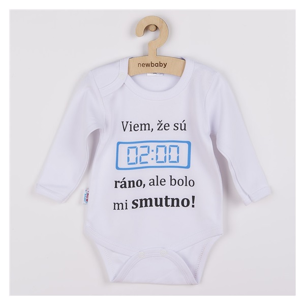 Originálne bavlnené dojčenské body s dlhým rukávom New Baby, s vtipným nápisom Viem, že sú 02:00 ráno, ale bolo mi smutno. Farby použité k potlači sú certifikované a vhodné pre bábätká. Je vyrobené z príjemného a kvalitného materiálu, v ktorom sa bude Vaše bábätko cítiť príjemne. Body má zapínanie na cvočky na ramienku a medzi nožičkami, čo uľahčuje obliekanie a prebaľovanie. Doprajte Vášmu bábätku vyniknúť v originálnom body. Zloženie: 100% bavlna. Rozmery: obvod okolo hrudníka cca 34 cm, dĺžka rukáva cca 16 cm, celková dĺžka cca 30 cm.