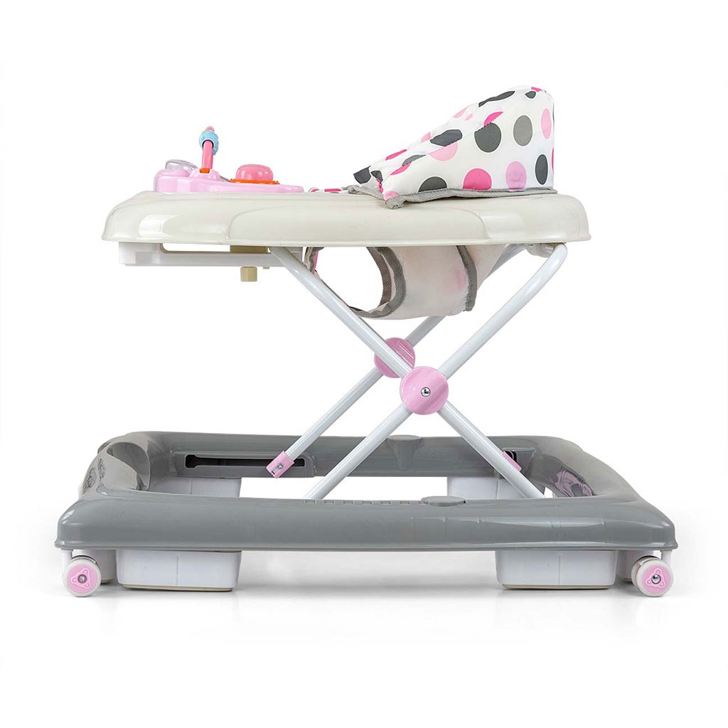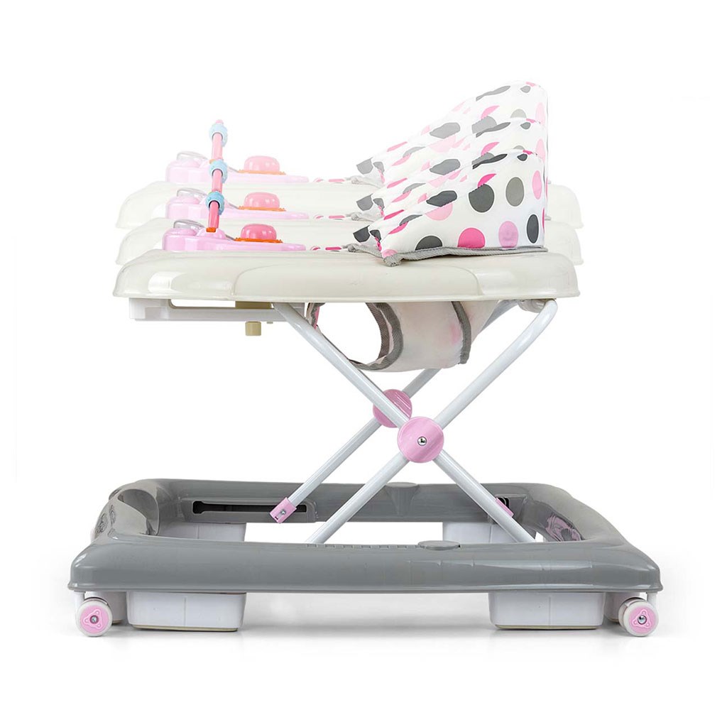 Štyri kvalitné otočné kolieska, ktoré nepoškriabu povrch, po ktorom sa pohybujú, zaistí voľnosť pohybu a osem gumových zarážok ochráni dieťa pred skĺznutím zo schodov alebo iných prekážok.