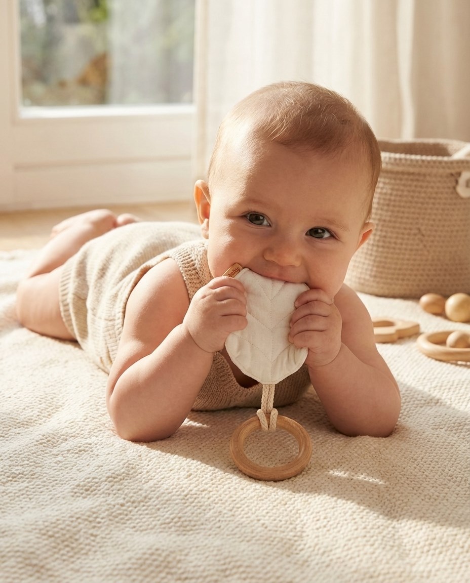 Hryzátko s mušelínovou plienkou je ideálna súprava, keď sa dieťaťu prerezávajú zúbky. Hryzátko je vyrobené z bukového dreva šetrného k životnému prostrediu a mäkkej mušelínovej tkaniny. Je úplne bezpečná pre bábätká a prináša upokojujúcu úľavu pri prerezávaní zúbkov. Hryzátko možno použiť aj ako hračku pre bábätká. Hryzátko sa dokonale hodí k našim ostatným mušelínovým výrobkom a vytvára krásnu súpravu, ktorú môžete darovať ako darček na oslavu narodenia dieťaťa.