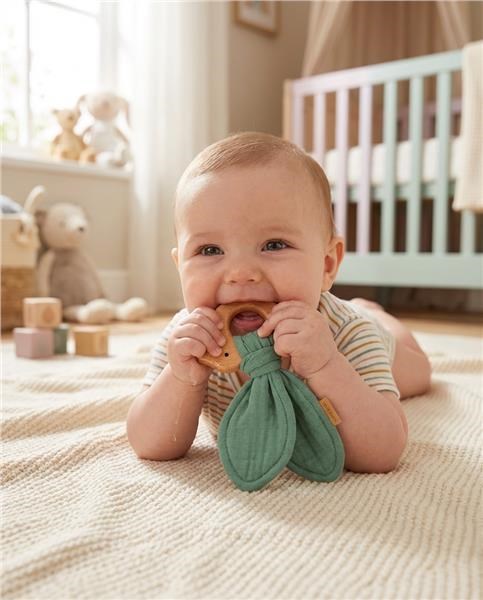 Hryzátko s mušelínovou plienkou je ideálna súprava, keď sa dieťaťu prerezávajú zúbky. Hryzátko je vyrobené z bukového dreva šetrného k životnému prostrediu a mäkkej mušelínovej tkaniny. Je úplne bezpečná pre bábätká a prináša upokojujúcu úľavu pri prerezávaní zúbkov. Hryzátko možno použiť aj ako hračku pre bábätká. Hryzátko sa dokonale hodí k našim ostatným mušelínovým výrobkom a vytvára krásnu súpravu, ktorú môžete darovať ako darček na oslavu narodenia dieťaťa.