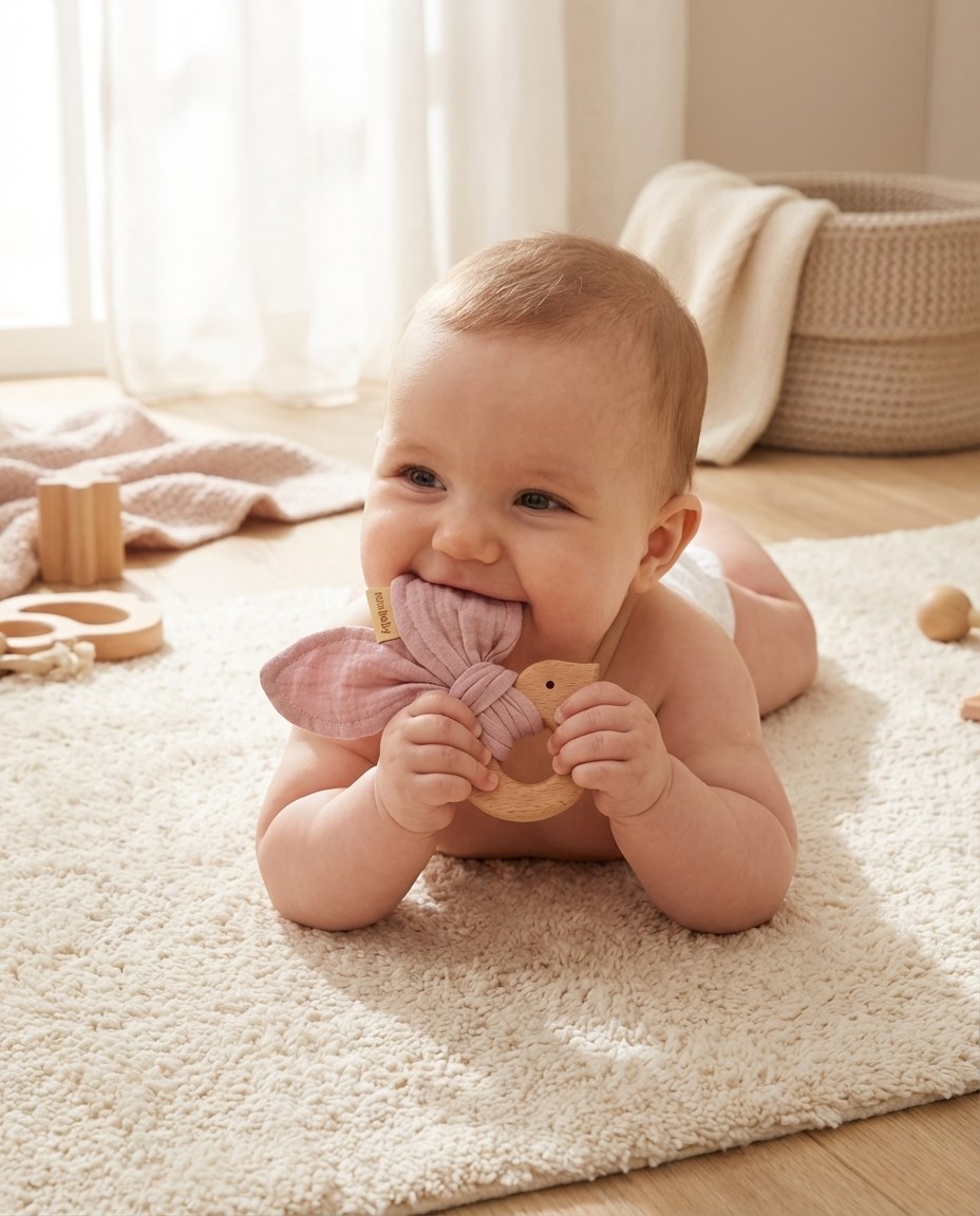 Hryzátko s mušelínovou plienkou je ideálna súprava, keď sa dieťaťu prerezávajú zúbky. Hryzátko je vyrobené z bukového dreva šetrného k životnému prostrediu a mäkkej mušelínovej tkaniny. Je úplne bezpečná pre bábätká a prináša upokojujúcu úľavu pri prerezávaní zúbkov. Hryzátko možno použiť aj ako hračku pre bábätká. Hryzátko sa dokonale hodí k našim ostatným mušelínovým výrobkom a vytvára krásnu súpravu, ktorú môžete darovať ako darček na oslavu narodenia dieťaťa.