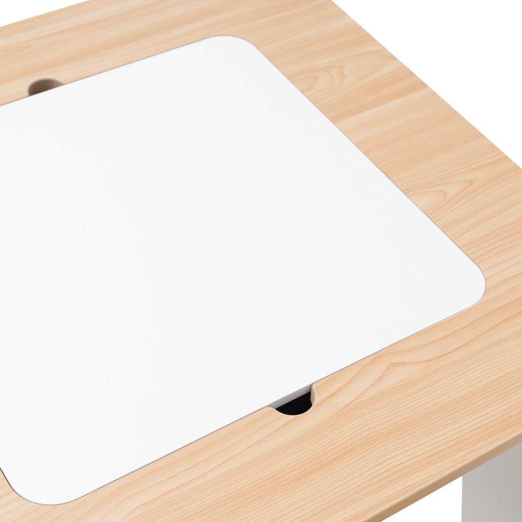 Súčasťou setu je stôl a dve stoličky vyrobené z odolného materiálu, ktorý zabezpečuje stabilitu a dlhú životnosť. Stôl je vybavený praktickou odnímateľnou doskou – pod ňou sa nachádza úložný priestor, kam možno jednoducho uložiť pastelky, papier, drobné hračky alebo stavebnice. Deti tak majú všetko potrebné vždy po ruke a zároveň si udržiavajú poriadok.