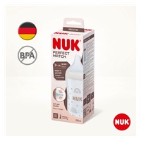 Dojčenská fľaša NUK Perfect Match s kontrolou teploty a mäkkým silikónovým cumlíkom. Špeciálny tvar typický pre cumlíky NUK s ortodontickým antikolikovým cumlíkom je modelovaný podľa materskej bradavky pri dojčení. Ponecháva dostatok priestoru pre prirodzené sacie pohyby jazyka aj čeľuste. Veľká, široká opora pier pri pití pripomína matkinu pokožku. Fľaša je navrhnutá tak, aby bábätko neprišlo do kontaktu s pevnými plastovými časťami. Vylepšený systém proti prehĺtaniu vzduchu pri pití Anti Colic Air System zabezpečuje prirodzený tok mlieka, aby dieťa pilo uvoľnene bez prehĺtania vzduchu. Hladko sa zužujúci tvar s antikolikovou funkciou pre plynulý a nerušený prietok pitia, veľkosť M (od 3 m, pre materské mlieko). Dojčenské fľaše sú teraz vybavené novým NUK kontrolným ukazovateľom teploty, ktorý pomáha zabrániť tomu, aby vaše dieťa pilo príliš horúci príkrm. Ukazovateľ vyzerá ako teplomer, je umiestnený medzi ryskami a teplota obsahu fľaše zmení jeho farbu. Ak je príkrm príliš horúci, modrý ukazovateľ sa zmení na biely. V ideálnom prípade by mal príkrm mať telesnú teplotu (37 °C), čo zodpovedá modrému zafarbeniu displeja. Vyrobená z vysoko kvalitného nerozbitného plastu polypropylénu a neobsahuje BPA (Bisfenol A). Obsah fľaše 260 ml. Vhodná pre deti od 3 m, veľkosť M (od 3 m = pre materské mlieko). Klinicky testované.