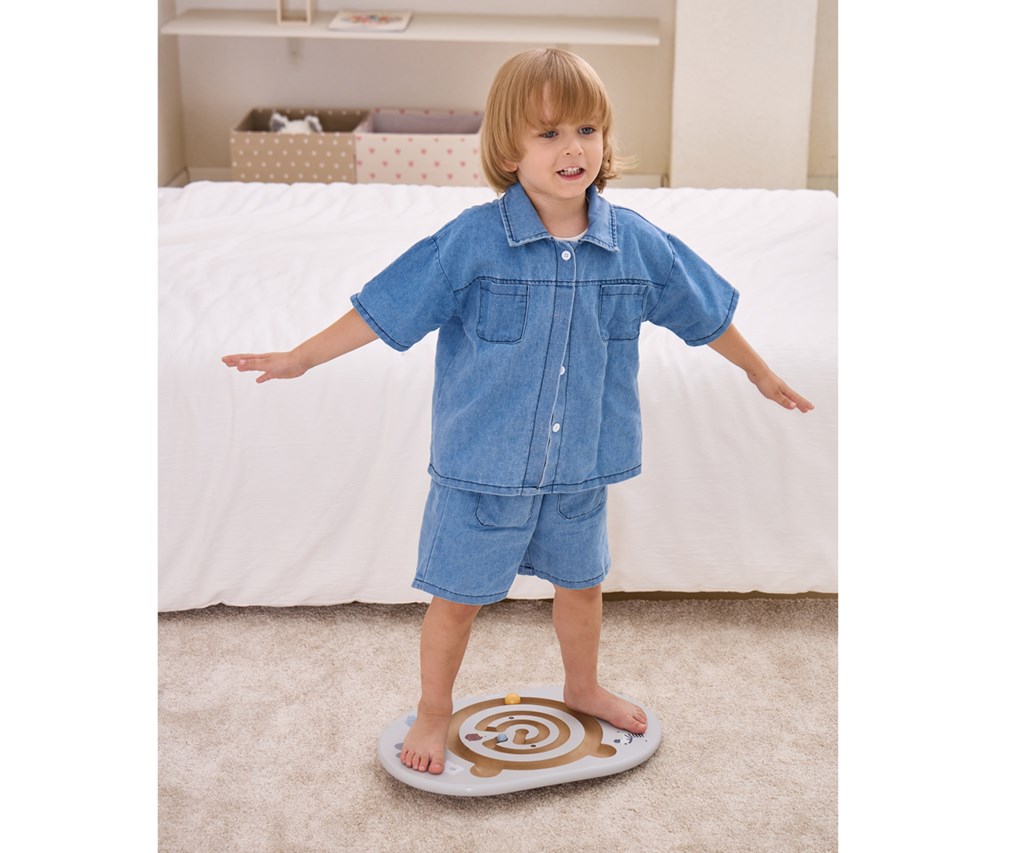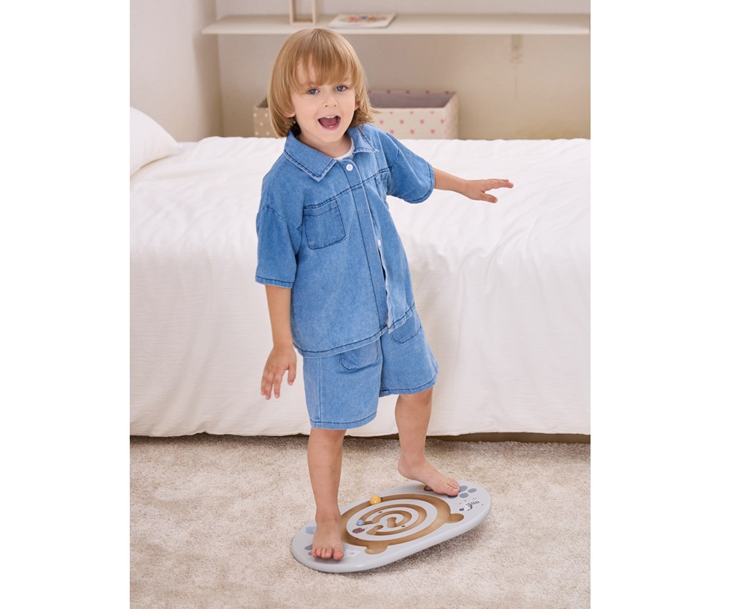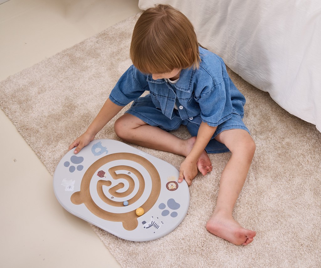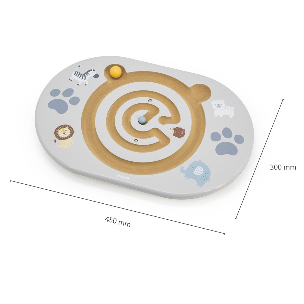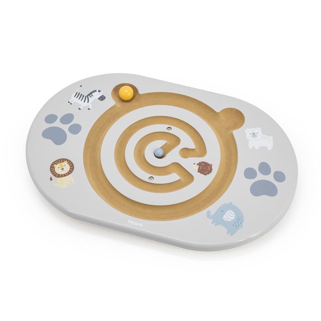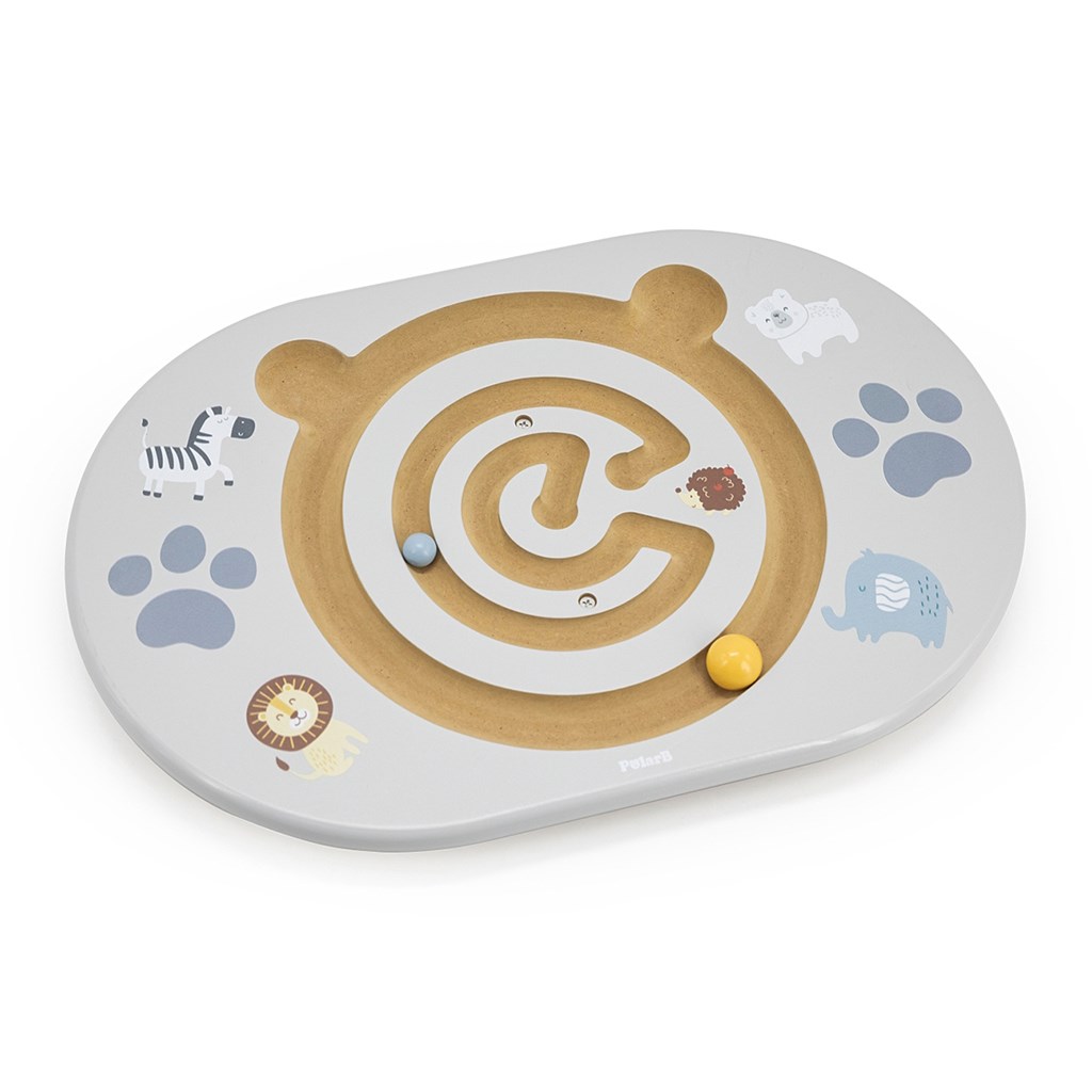 Balansujúci labyrint je ideálna hračka pre deti od 4 rokov, ktorá podporuje rozvoj rovnováhy, pohybovej koordinácie a koncentrácie. Sada obsahuje balančnú dosku s vyfrézovaným labyrintom v tvare medvedíka a dve drevené guličky. Úlohou dieťaťa je pomocou balansovania posúvať guľôčku po dráhe, čím si hravou formou trénuje rovnováhu a kontrolu tela.