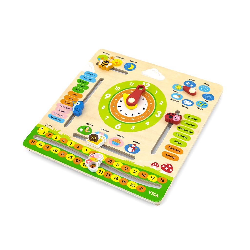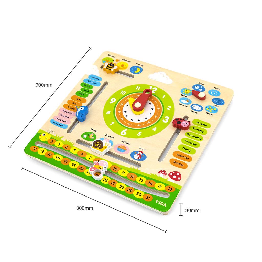 Objavovanie sveta s dreveným kalendárom s hodinami v angličtine od Viga Toys je ideálna "vzdelávacia" a darčeková sada, vhodná na hodiny angličtiny ako názorný materiál. Učenie hodín na analógových hodinách bude s tabuľkou Viga jednoduchšie a hra s kalendárom podporí učenie sa čítať a písať dátum. Dieťa sa naučí názvy mesiacov, dní v týždni, ročných období a dní a pojmy súvisiace s počasím v angličtine. S učebnou tabuľou budú môcť rýchli žiaci objavovať a učiť sa a zároveň sa zabávať. Súprava na učenie času je vhodná aj na rozvoj Montessori. Ideálna hračka na zavesenie doma, v škôlke alebo v škole.
