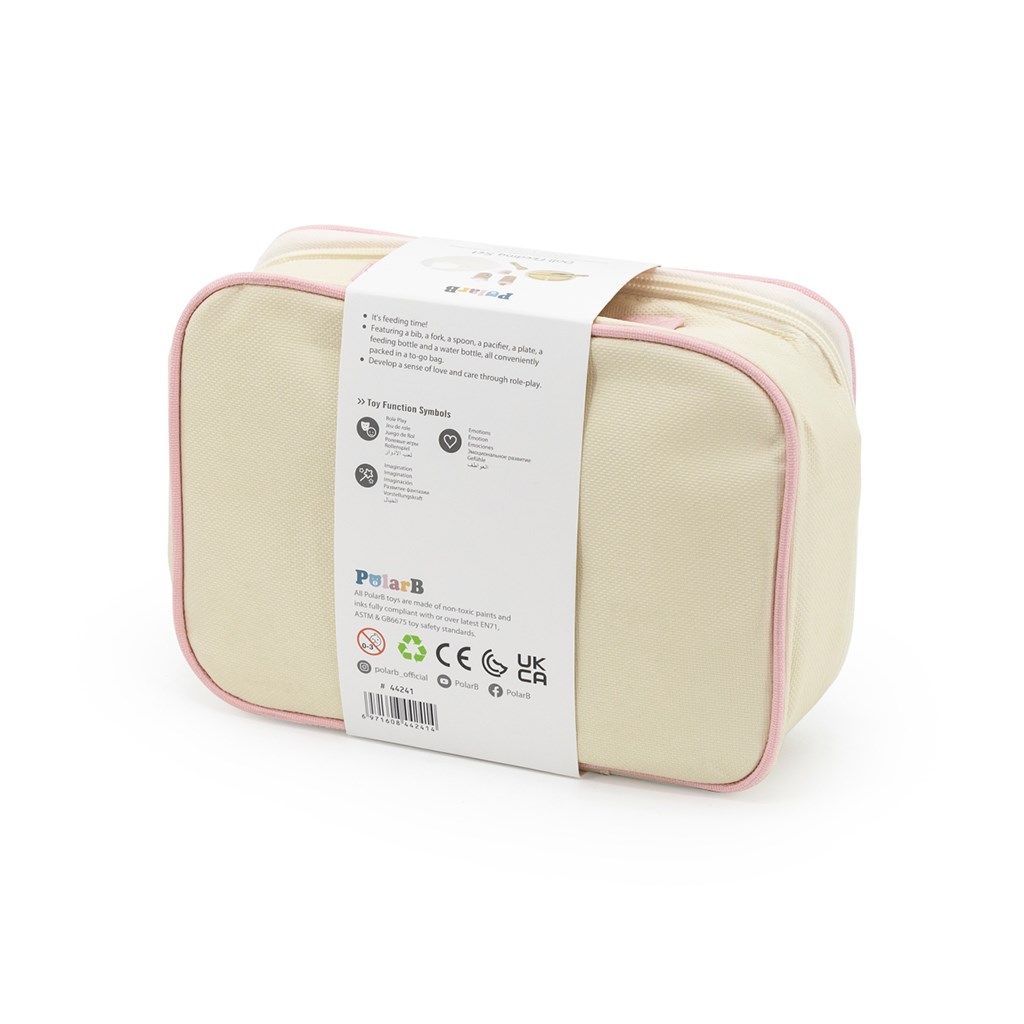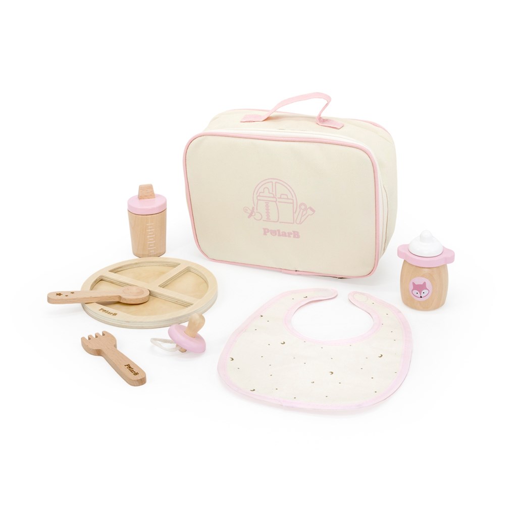 V súprave sa nachádza: podbradník, vidlička, lyžička, cumlík, tanierik, fľaša na kŕmenie a fľaša s vodou – všetko prehľadne zabalené v textilnom organizéri.