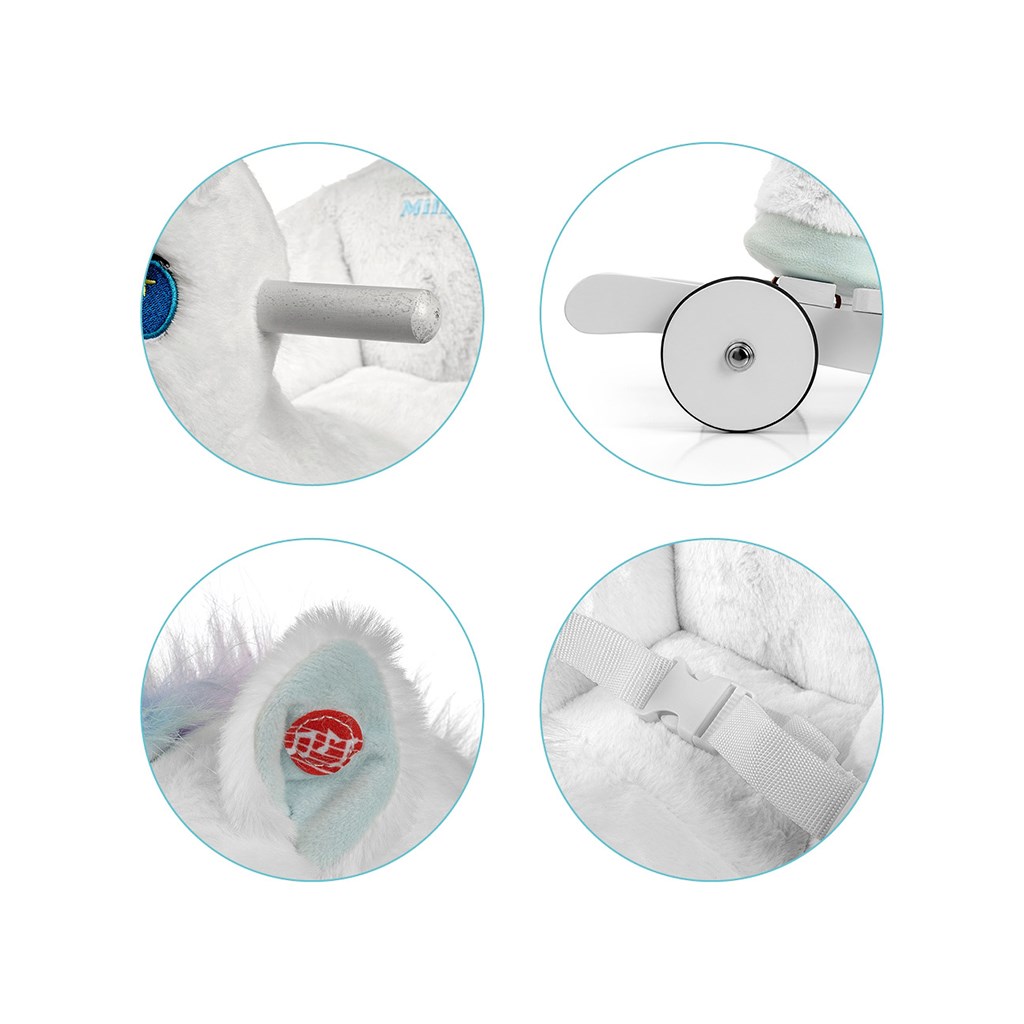 Hojdací koník je vyrobený z jemného, na dotyk príjemného plyšového materiálu. Má šatku na krku, uzdečku, podnožky na lyžinách a interaktívne ušká. Po stlačení jedného uška sa ozve zvuk cválajúceho koníka s erdžaním, pri dotyku druhého zasa veselé erdžanie.