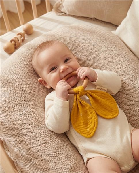 Hryzátko s mušelínovou plienkou je ideálna súprava, keď sa dieťaťu prerezávajú zúbky. Hryzátko je vyrobené z bukového dreva šetrného k životnému prostrediu a mäkkej mušelínovej tkaniny. Je úplne bezpečná pre bábätká a prináša upokojujúcu úľavu pri prerezávaní zúbkov. Hryzátko možno použiť aj ako hračku pre bábätká. Hryzátko sa dokonale hodí k našim ostatným mušelínovým výrobkom a vytvára krásnu súpravu, ktorú môžete darovať ako darček na oslavu narodenia dieťaťa.