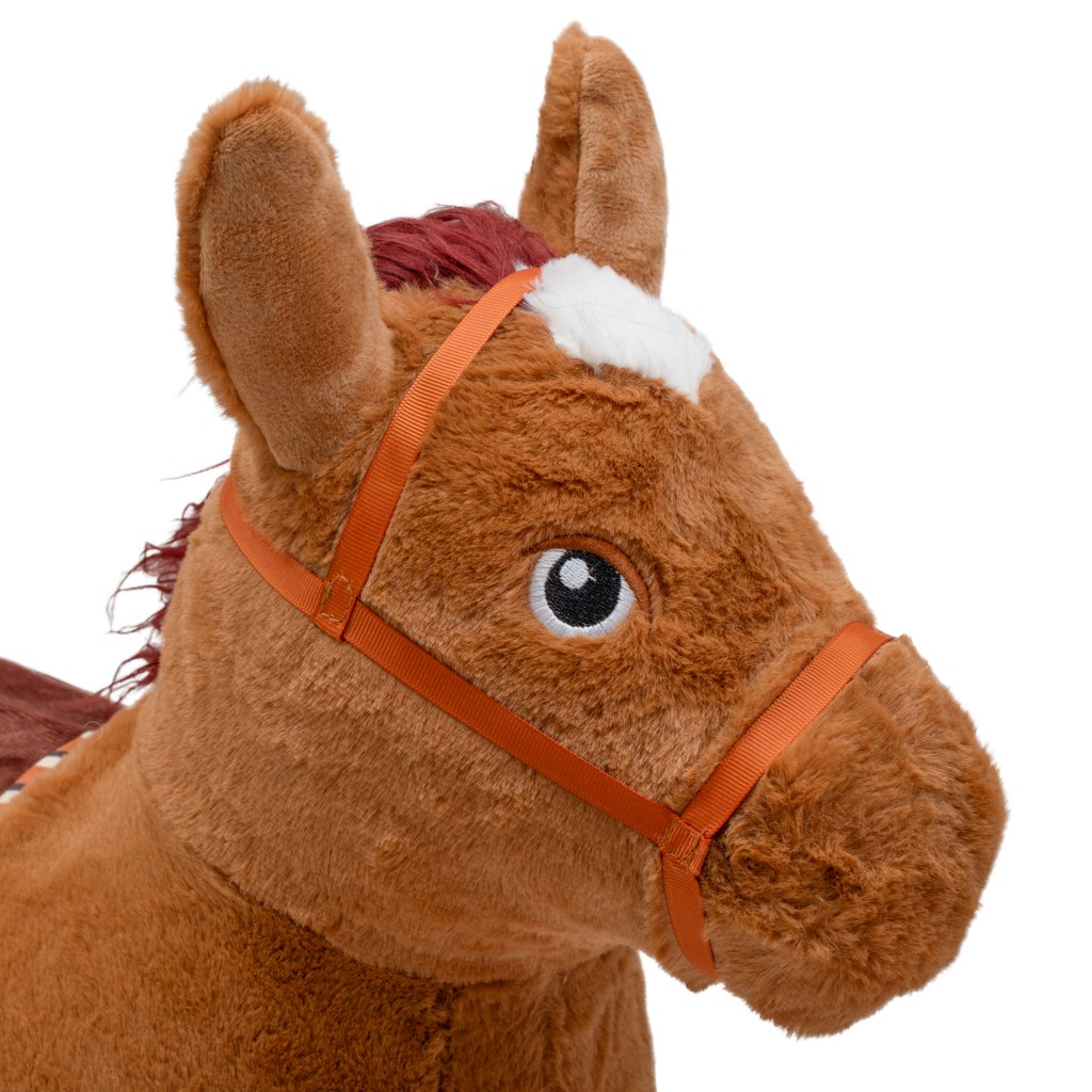 Skákadlo je potiahnuté mäkkým, protišmykovým plyšom, veľmi príjemným na dotyk. Je vybavené zvukovým modulom – po stlačení medzi uškami vydáva realistický zvuk koníka, čo podporuje fantáziu a motivuje k aktívnej hre.