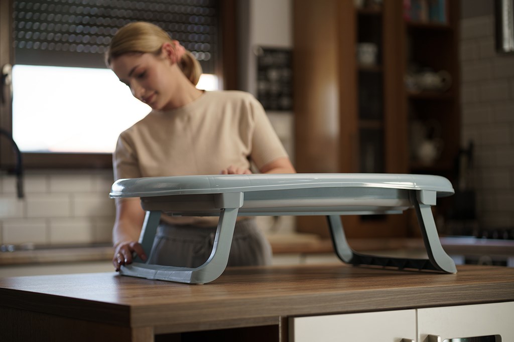 Vanička je vybavená výpustným ventilom a pásikovým teplomerom, čo výrazne zvyšuje komfort a bezpečnosť pri každodennom používaní. Dá sa jednoducho zložiť na výšku len 10 cm, pričom plastové nožičky sa sklopia priamo pod vaničku – vďaka čomu zaberá minimum miesta a je ideálna na skladovanie aj v menších priestoroch.