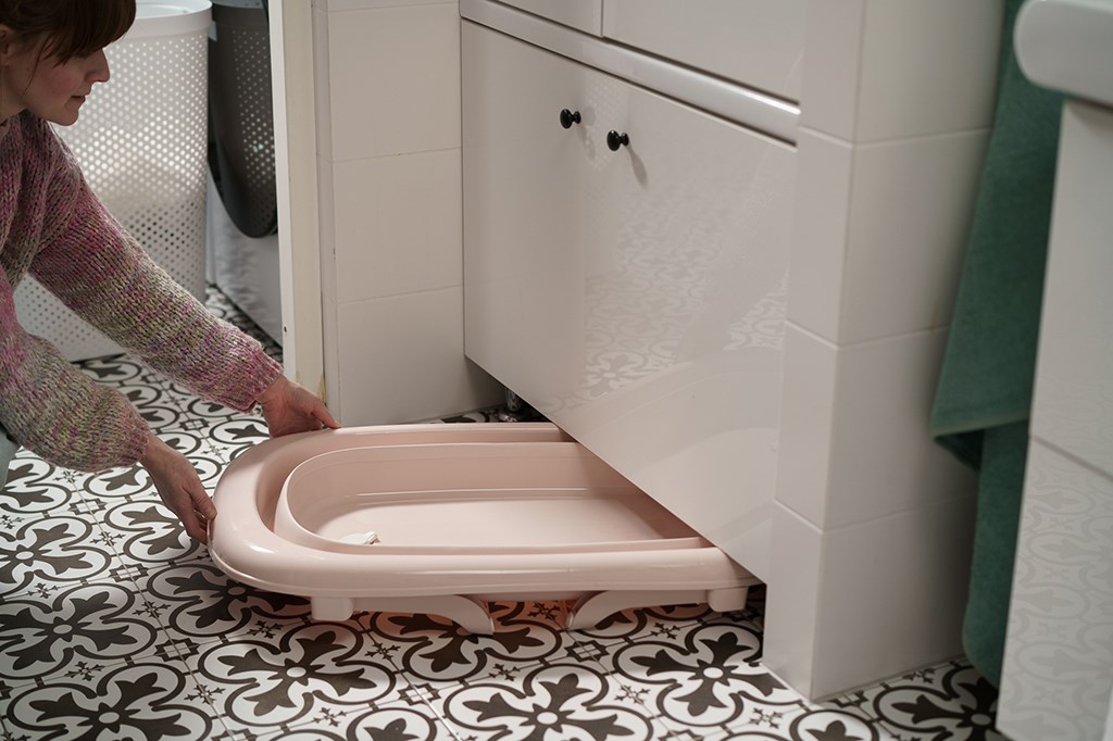 Vanička je vybavená výpustným ventilom a pásikovým teplomerom, čo výrazne zvyšuje komfort a bezpečnosť pri každodennom používaní. Dá sa jednoducho zložiť na výšku len 10 cm, pričom plastové nožičky sa sklopia priamo pod vaničku – vďaka čomu zaberá minimum miesta a je ideálna na skladovanie aj v menších priestoroch.