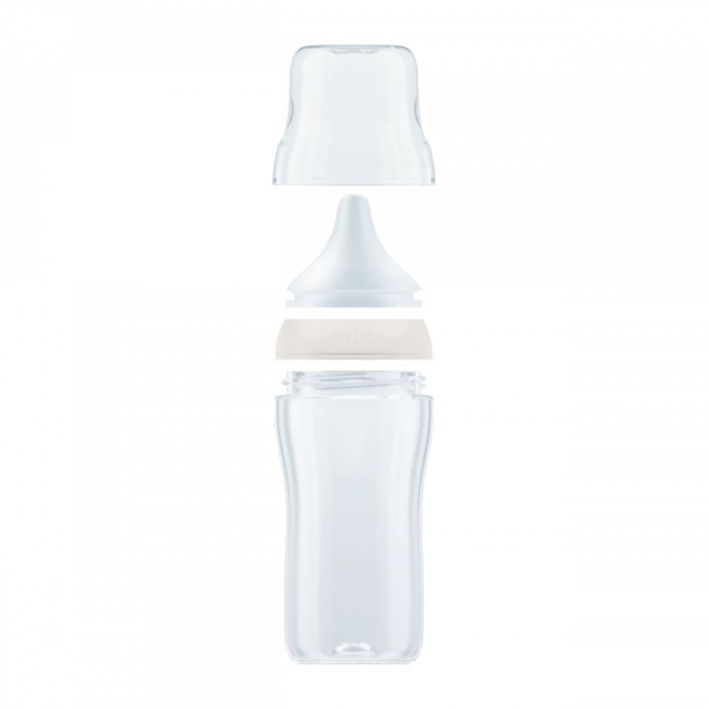 Sklenená dojčenská fľaša NUK Perfect Match s kontrolou teploty a mäkkým silikónovým cumlíkom. Špeciálny tvar typický pre cumlíky NUK s ortodontickým antikolikovým cumlíkom je modelovaný podľa materskej bradavky pri dojčení. Ponecháva dostatok priestoru pre prirodzené sacie pohyby jazyka aj čeľuste. Veľká, široká opora pier pri pití pripomína matkinu pokožku. Fľaša je navrhnutá tak, aby bábätko neprišlo do kontaktu s pevnými plastovými časťami. Vylepšený systém proti prehĺtaniu vzduchu pri pití Anti Colic Air System zabezpečuje prirodzený tok mlieka, aby dieťa pilo uvoľnene bez prehĺtania vzduchu. Hladko sa zužujúci tvar s antikolikovou funkciou pre plynulý a nerušený prietok pitia, veľkosť M (od 3 m, pre materské mlieko). Dojčenské fľaše sú teraz vybavené novým NUK kontrolným ukazovateľom teploty, ktorý pomáha zabrániť tomu, aby vaše dieťa pilo príliš horúci príkrm. Ukazovateľ vyzerá ako teplomer, je umiestnený medzi ryskami a teplota obsahu fľaše zmení jeho farbu. Ak je príkrm príliš horúci, modrý ukazovateľ sa zmení na biely. V ideálnom prípade by mal príkrm mať telesnú teplotu (37 °C), čo zodpovedá modrému zafarbeniu displeja. Vyrobená z vysoko kvalitného skla a neobsahuje BPA (Bisfenol A). Obsah fľaše 230 ml. Vhodná pre deti od 3 m, veľkosť M (od 3 m = pre materské mlieko). Klinicky testované.